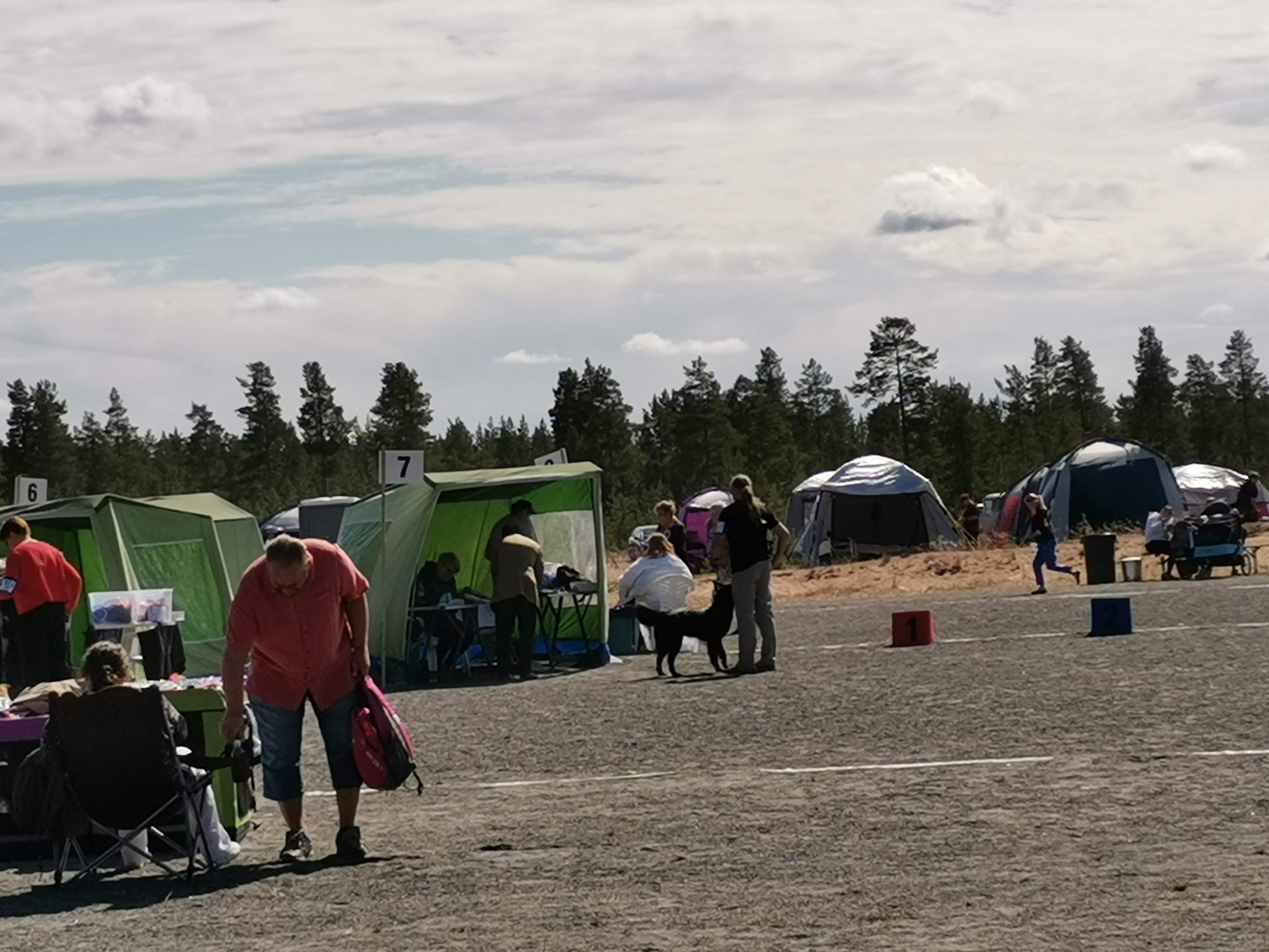 Eillisessa kokeessa aloitettiin aamulla tottiksilla. Olisin mieluiten ottanut Minalle maastot ensin, koska tiesin että sillä riittää virtaa ja intoa liikaakin, joten olisi ollut mieltä rauhoittavaa pistää sen ensin maastoon hieman kuluttamaan ylimääräisiä höyryjä. Mutta koska oletin että tottiksesta joka tapauksessa nollautuu tärkeitä liikkeitä, niin eipä järjestyksellä niin väliä. Mina oli koeaamuna mukavan vireä, ja omaa vuoroa odotellessa otin sen ulos ja teimme hieman lämmittelyhyppyjä toisella kentällä, sekä kuuntelimme paukkuja joita aiemmille suorittajille ammuttiin. Meidän vuoron tullessa olin vähän rennompi ja sain hetsattua Minaa juuri sopivasti ennen kuin menimme ilmoittautumaan tuomarille. Mina pääsi ensin suorittamaan liikkeet ja parimme, pitkäkarvainen collie, meni paikkikseen. Lähtöpaikalle mennessä Mina pysyi hyvin kontaktissa ja ehdin jo vähän ilahtua, että seuruu saattaisi sittenkin mennä hyvin. Ehdin juuri kytkeä Minan irti remmistä ja ottaa perusasennon, kun paikkispaikalta alkoi kuulua mölinää. Collie veti siellä rallia ohjaajansa ympärillä haukkuen, ja kesti hetken, ennen kuin se rauhoittui ja ohjaaja sai sen menemään maihin. Minahan toki heti ekasta haukahduksesta fokusoitui täysin collieen ja oli aivan jousilla valmiina pomppaamaan ja juoksemaan toisen koiran luo, joko mukaan leikkiin tai tapellakseen, en olisi aivan varma. Siinä vaiheessa oma sydän kyllä hyppäsi kurkkuun ja taisin vaistomaisesti hetkeksi ottaa Minaa kiinni kaulalta, vaikkei toki kokeessa koiraa saisi pidellä, mutta hetken pelkäsin että collie lähtisi meitä kohti ja minun pitäisi tempaista oma koira syliin tms että tappelulta vältyttäisiin. Onneksi collie kuitenkin näytti pysyvän maissa kun ohjaaja sen sinne jätti. Mina kuitenkin kyttäsi paikkispaikalle päin niin tiiviisti, että meinasin heittää jo hyvästit seuruutukselle ennen kuin olimme ottaneet askeltakaan. Pidin vasemman käteni valmiudessa tarttumaan Minaa niskavilloista, jos se yritäisi karata collien luo seuruusta. Mutta ihmeekseni Mina kuitenkin pysyi seuruussa, laukausten aikana se vähän hämääntyi ja se unohti collien ja sen jälkeen seuruu oli oikein nättiä ja tiivistä (vähän liiankin tiivistä välissä). Teimme J-kaavion ongelmitta, ja ihmisryhmänkin suoritimme kunnialla. Aiemmin Mina on haahuillut ihmisryhmät läpi sen vähän mitä olemme sitä päässeet treenaamaan, joten yllätyin miten Mina nyt ignoorasi ihmiset täysin. Ehkä collie-häiriön jälkeen se ei enää antanut pienempien häiriöiden vaivata itseään?